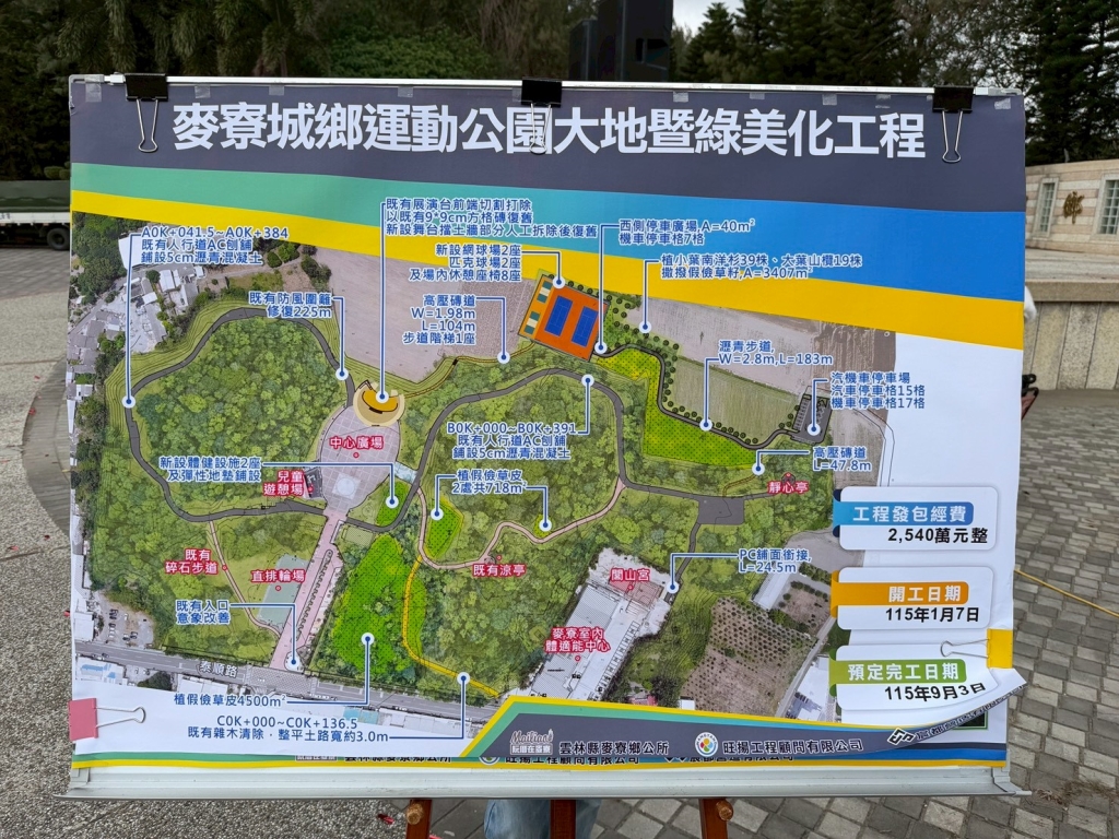 鄉長許忠富指出,麥寮城鄉運動公園占地達8.8公頃,自完工至今已逾三十載。隨著鄉內人口成長與運動休閒需求多元化,現有設施已趨飽和且面臨老舊問題。為此,鄉公所自籌3,000萬元專案經費,針對園區進行全面升級,施工總面積約31,450平方公尺,預計於115年9月完工。