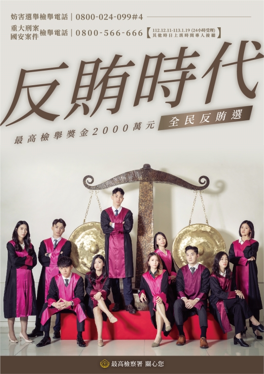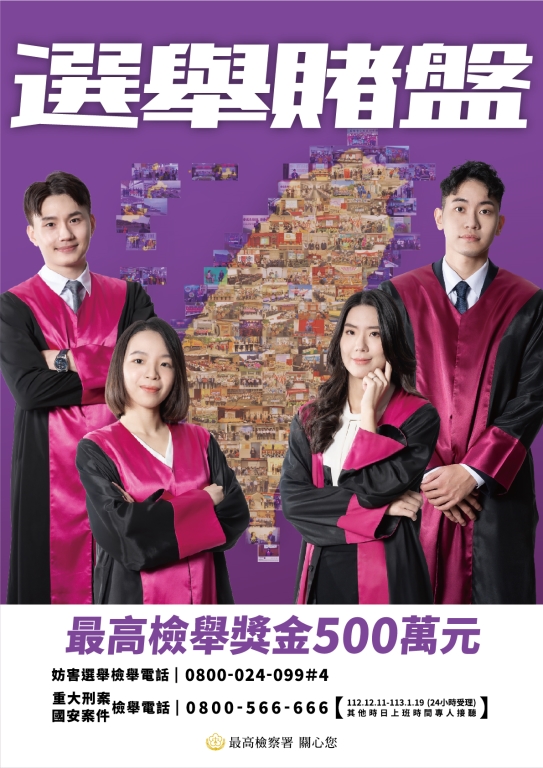 最高檢察署為加強113年第16任總統副總統及第11屆 立法委員選舉反賄選宣導,製作「反賄時代,全民反賄 選」等4款海報