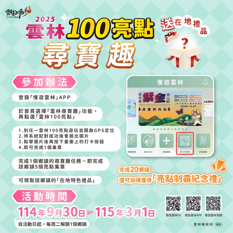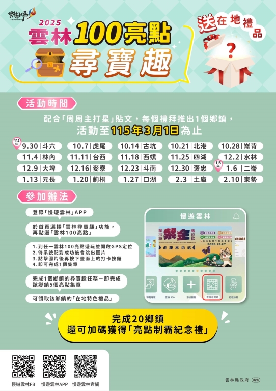 轉知雲林縣政府辦理「2025年雲林100亮點」行銷與「尋寶趣」之兌獎活動