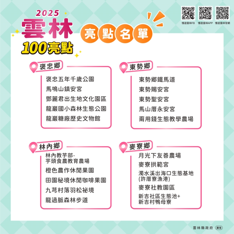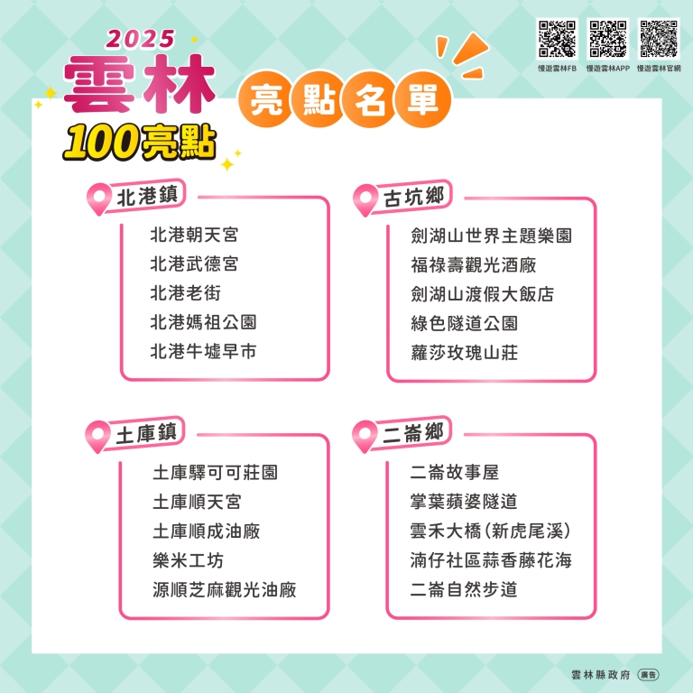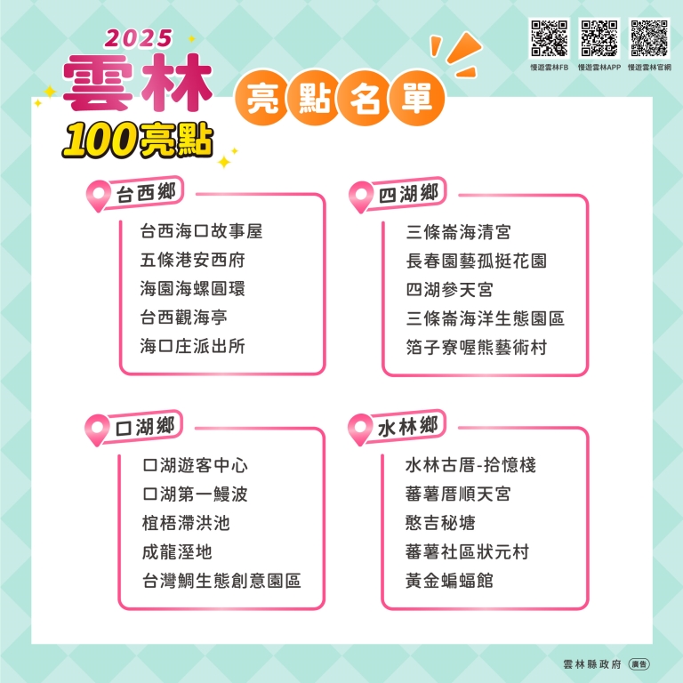 並於9月8日公布最終入選之「2025雲林100亮點」,該亮點榜單象徵雲林最具