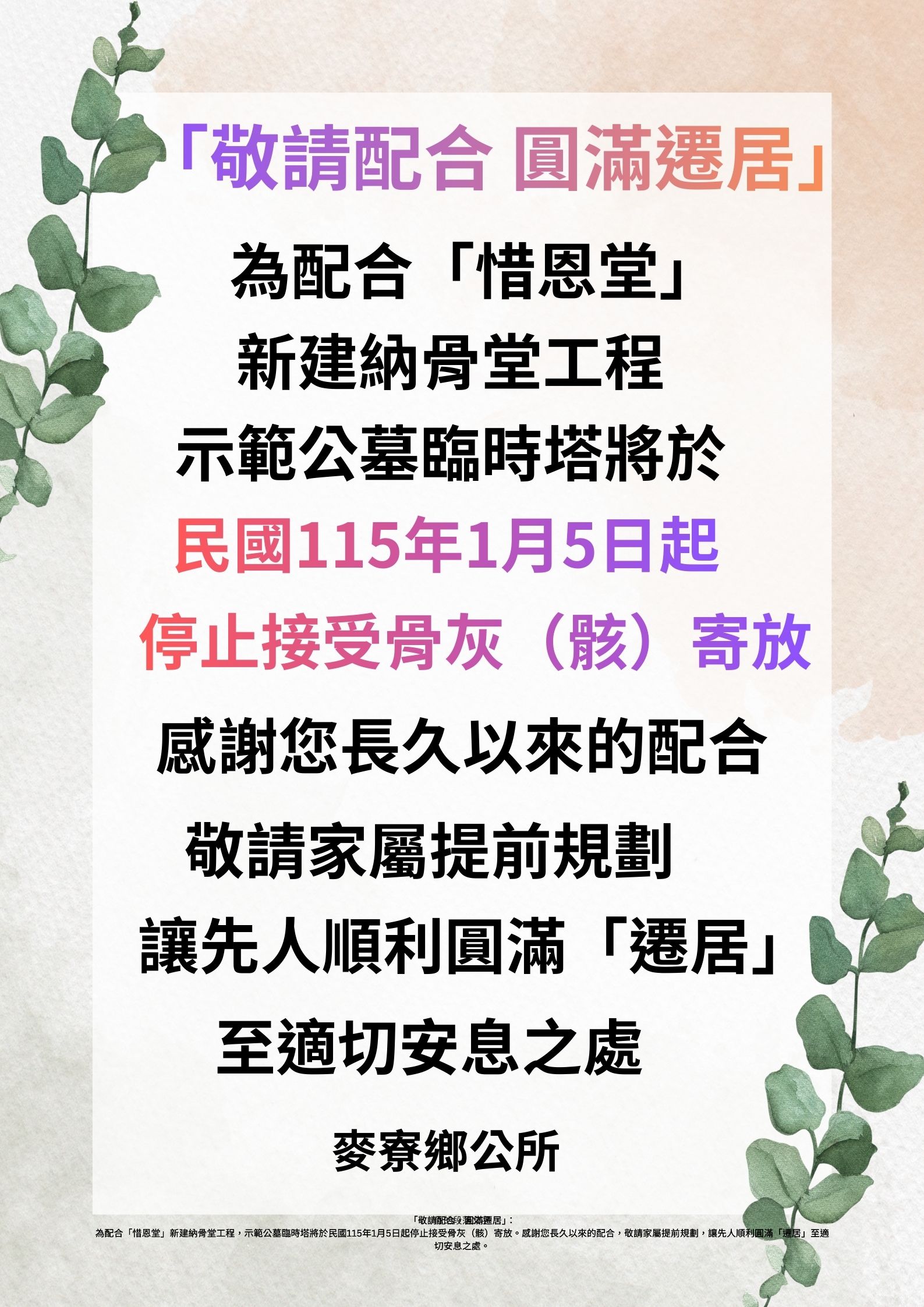 【重要公告:示範公墓臨時塔停止受理寄放】