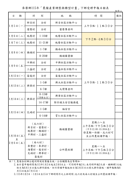 3️⃣1/16~2/6 :北六村至橋頭圖書館(星期一圖書館休館,可至公所申報),南七村至公所農經課申報。