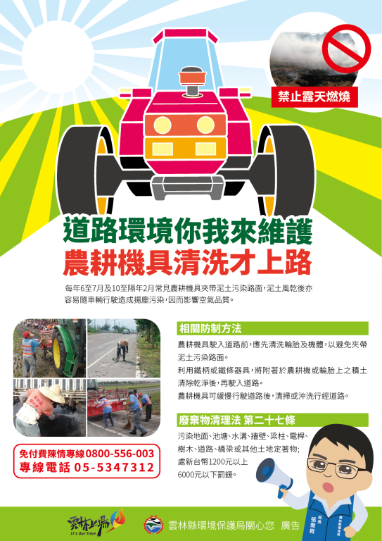 二、為避免農耕機具掉落泥土汙染路面,並危及用路人安全,