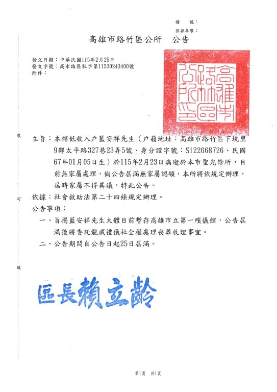 115年3月2日高雄市路竹區區民 藍安祥 君死亡公告1份