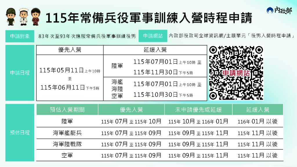 ✨115年83至93年次役男常備兵役軍事訓練入營時程申請須知✨